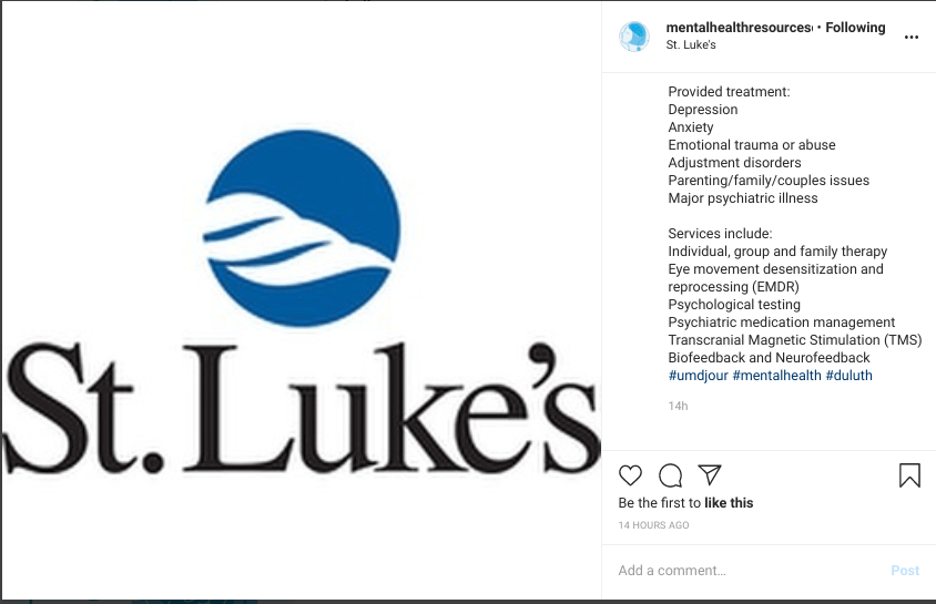 I chose to post about St. Luke’s mental health resources because it is very accessible to the UMD student populace. They take Medica, the health care provider for UMD, and it would only take a short bus ride to get there.